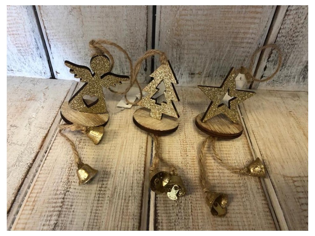 Dřevěný závěs se zvonky-stromek/hvězda/anděl 4x4/v.23cm. Uvedená cena je za1 ks. Do ponznámky v objednávce prosím uveďte, o jaký typ máte zájem. Děkujeme.